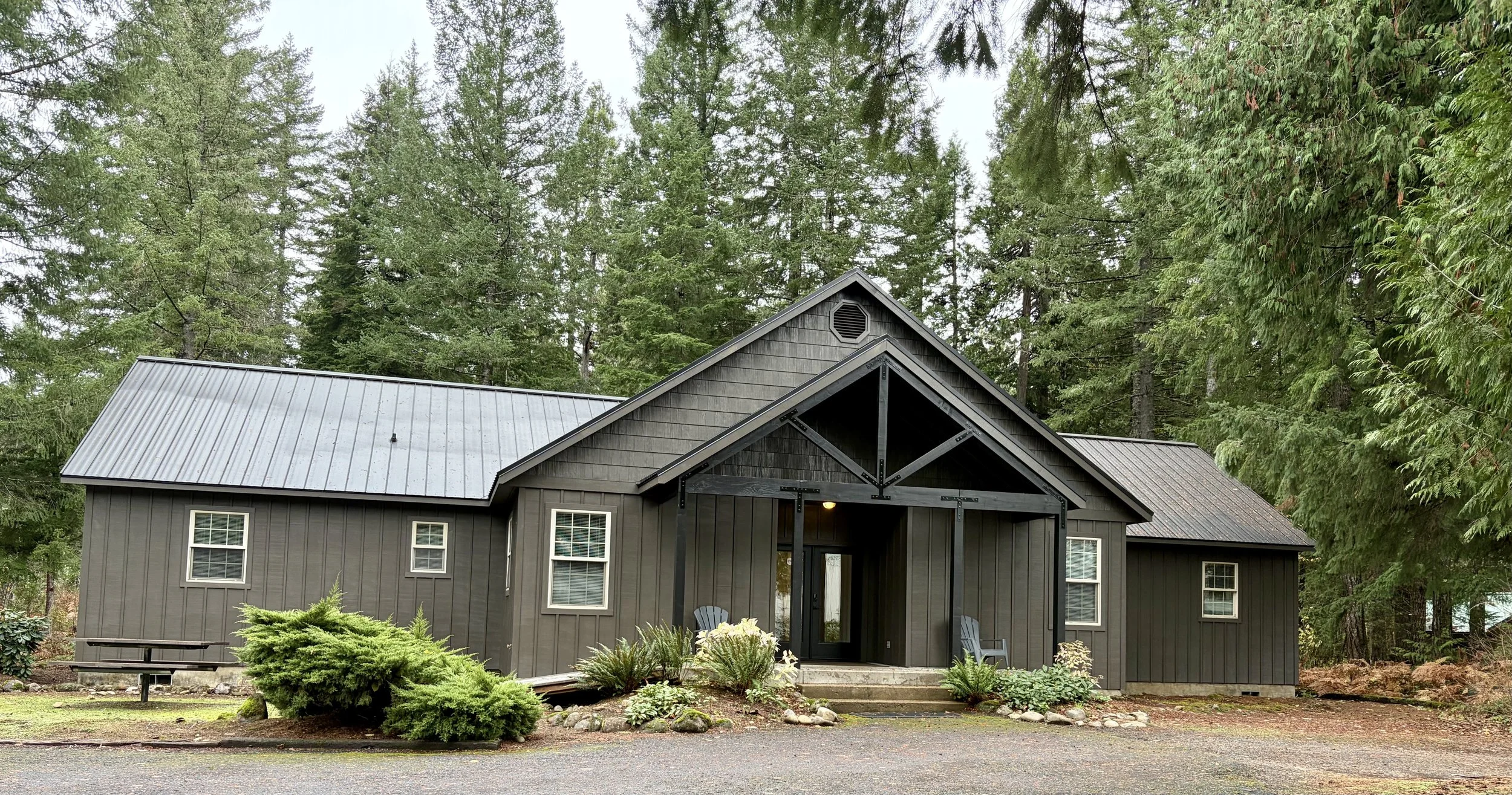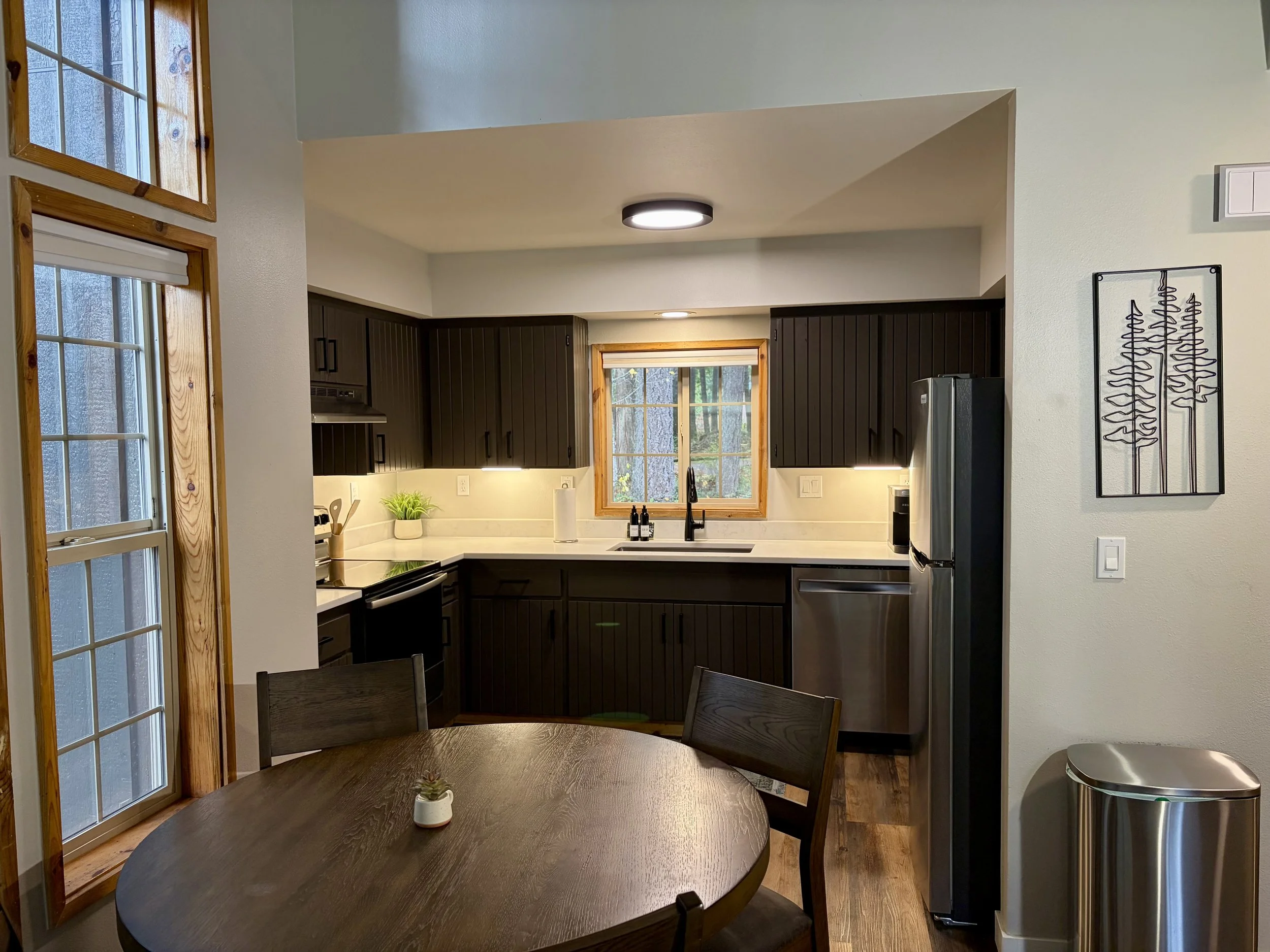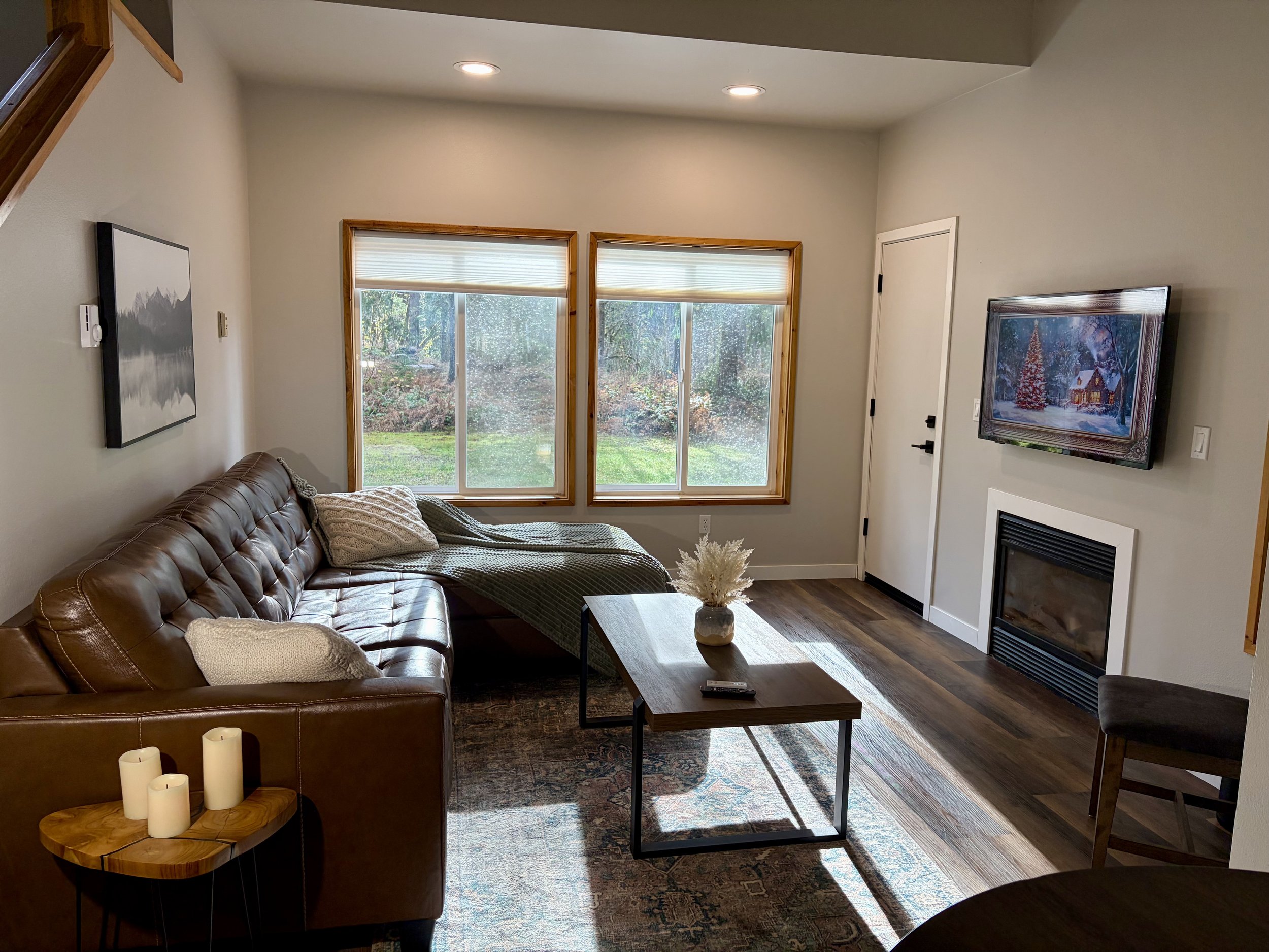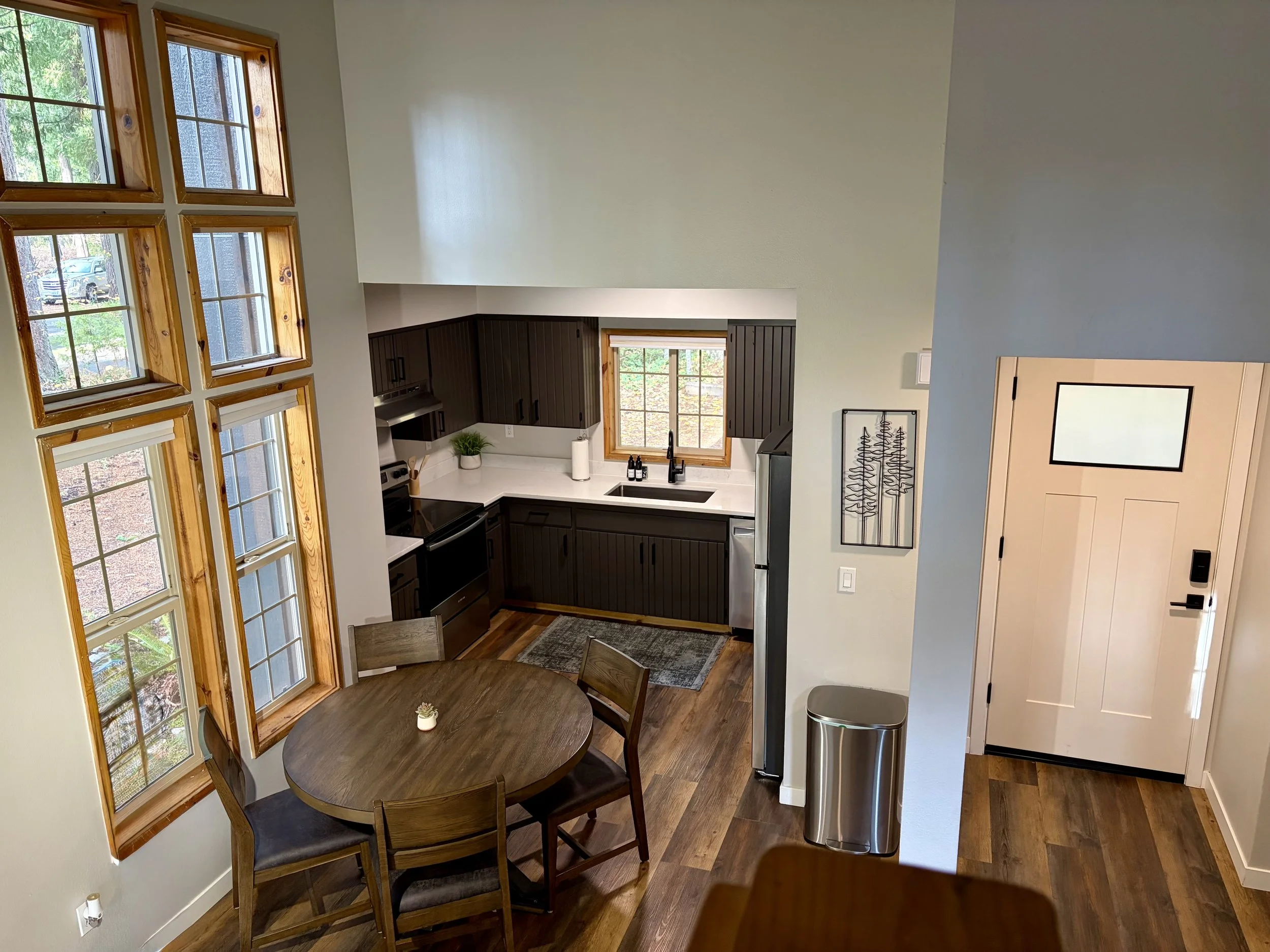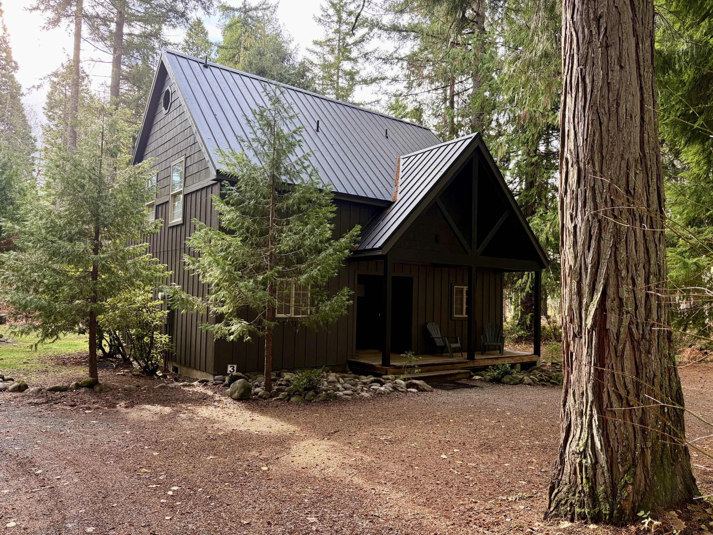 Tucked away in the trees, our private 3-bedroom / 2-bathroom cabin with full kitchen, living room, and dining space. Parking and outdoor space. Downstairs offers (1) queen bedroom and full bathroom, upstairs offers (2) queen bedrooms with (1) shared bathroom. Outdoor parking, private front porch, and backyard area.